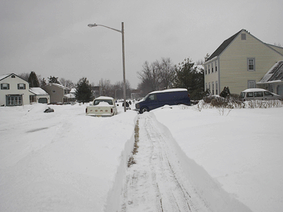 Sidewalk picture looking east on our street. Thank God for Snow Blowers! (Especially the Gas Powered kind!) Just that one strip took two passes and a total of 6 minutes with a five and a half horse power snow blower. On top of the snow, this morning dropped about an inch or so of Sleet. Was like trying to dig out a sundae with magic freeze topping. |